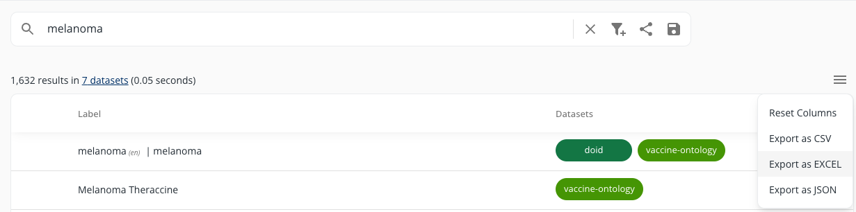 To export the search results, click the burger menu icon in the right corner above the search results table and choose the desired export format.