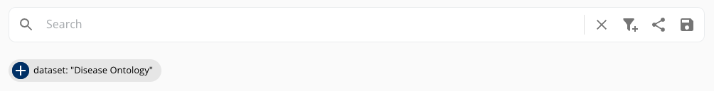 Filters can be applied to restrict the search to specific datasets or based on specific metadata. Enter the filter dialog by clicking the "Add new filter" icon . To invert the filter, hover over the applied filter badge and select Exclude matches.