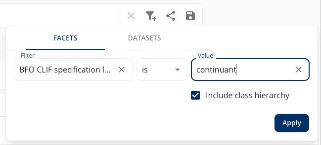 The additional filter option Include class hierarchy is available for specific predicates. The filter will also include the selected Value subclass hierarchy if this option is selected. This can be useful if you want to consider a specific subtree in your search.