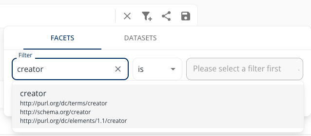You can filter the search for the presence or absence of specific metadata statements. To do that, select FACETS and select a predicate in the Filter field. Click the Value field to select from all available values for the chosen predicate. A click on APPLY activates the filter.