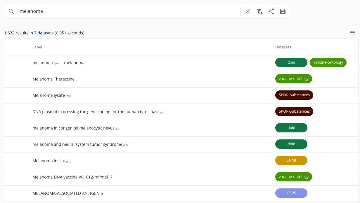 Accurids performs an instant search with each character you type. Search results are displayed by their preferred label in descending order of relevance. The dataset badge indicates the matching dataset. The number of results is displayed at the top of the table, along with the number of datasets where the search item appears.