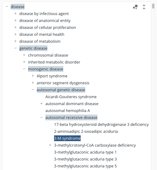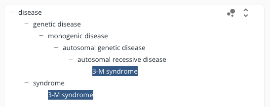 The tree shows the path from the dataset's root element to the selected entity. The parent entities on the path to the root are highlighted. If the entity is present in multiple positions of the hierarchy, the different paths to the root are shown as breadcrumbs on the right, which can be selected for display in the treeview. If the selected entity is not included in the tree hierarchy, it is displayed on top next to the root node.